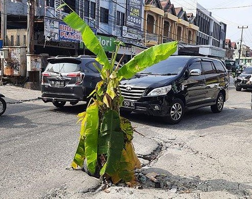 PEKANBARU - Viral warga terpaksa menanam pohon pisang di satu ruas jalan rusak Jalan Paus, Kota Pekanbaru.Masyarakat memasang batang pisang di bahu jalan lantaran ruas jalan rusak itu belum kunjung diperbaiki.Informasi Tribunpekanbaru.com, batang pohon pisang itu dipasang untuk menghindari kecelakan terjadi.Ada beberapa kali kecelakaan akibat jalan rusak di kawasan itu.Posisi ruas jalan rusak itu tidak jauh dari simpang Jalan Pari.Mereka berharap ruas jalan ini segera diperbaiki karena sudah