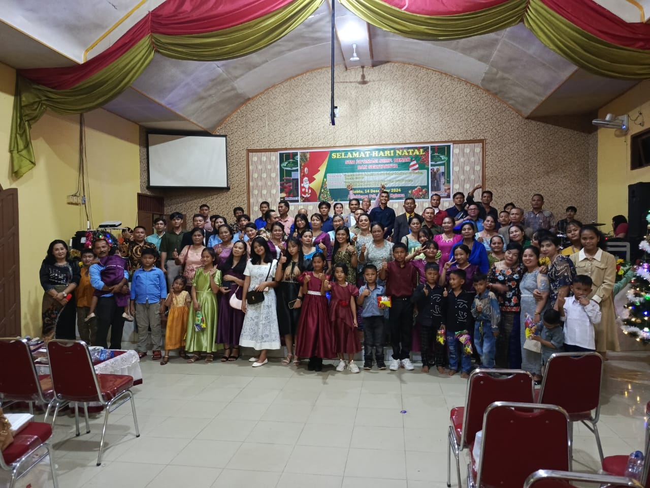 Serikat Nias kasih dengan bahasa kampung aslinya faomasi merayakan Natal di gedung gereja GPdI Efata menggala jhonson jalan lintas Riau Sumut Sabtu (14/12/2024).
